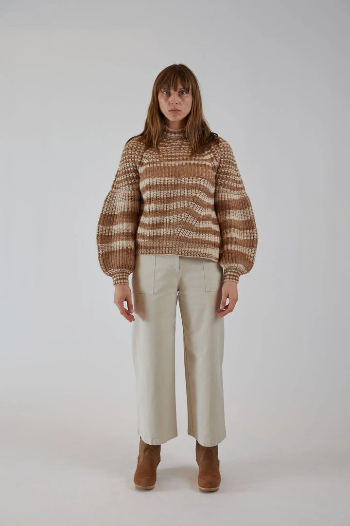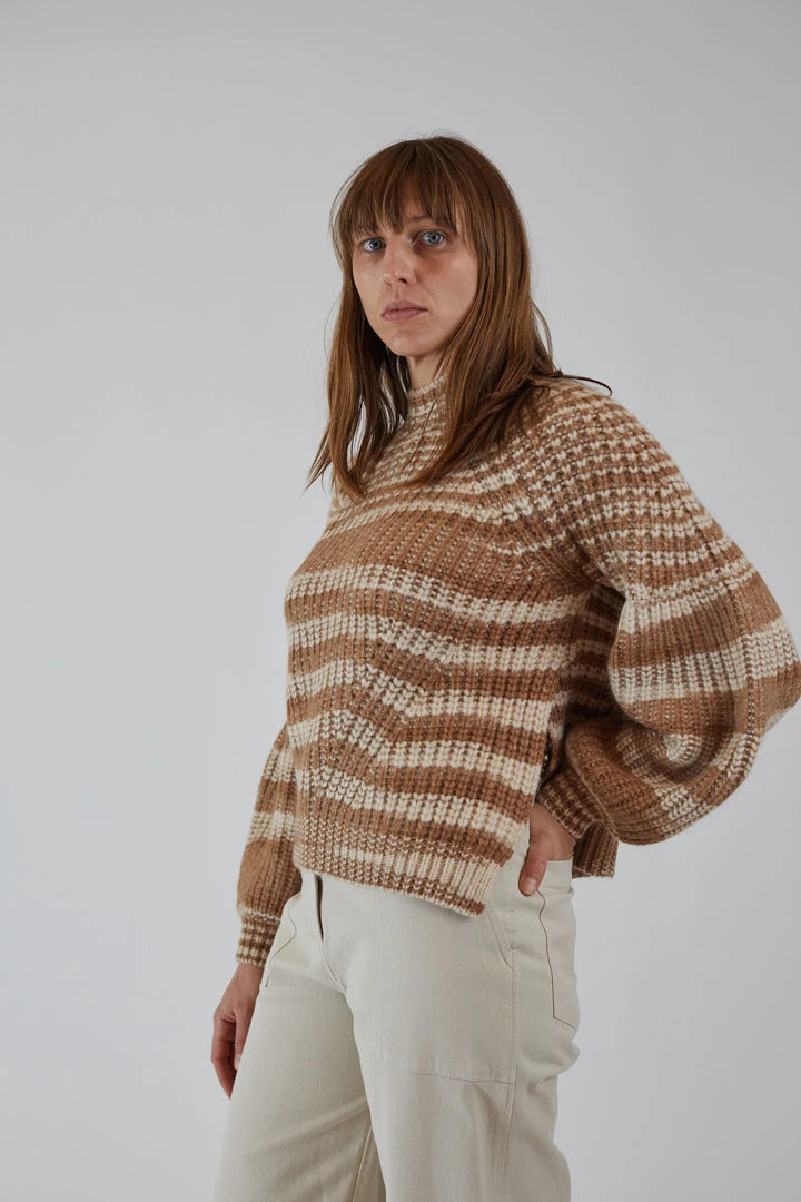 The Lucille Pullover is made from super soft baby alpaca with a space dye effect. High neckline style pullover featuring asymmetrical hemline and slouchy sleeves.