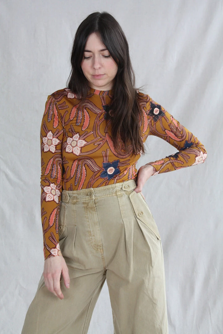 The Eve top in a bold floral print fo layering or standing out. This jersey top is meant to fit close to the body, with a crew neckline and full length sleeves.