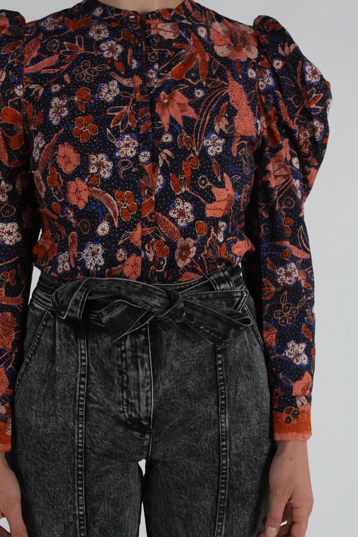 An Ulla Johnson forever favorite, the Willa Blouse returns in a signature printed cotton poplin in a rich midnight blue floral. Long sleeve style featuring voluminous shoulders and center front button down closure. Unlined.