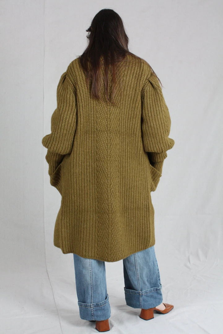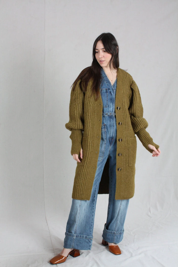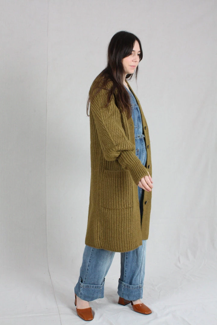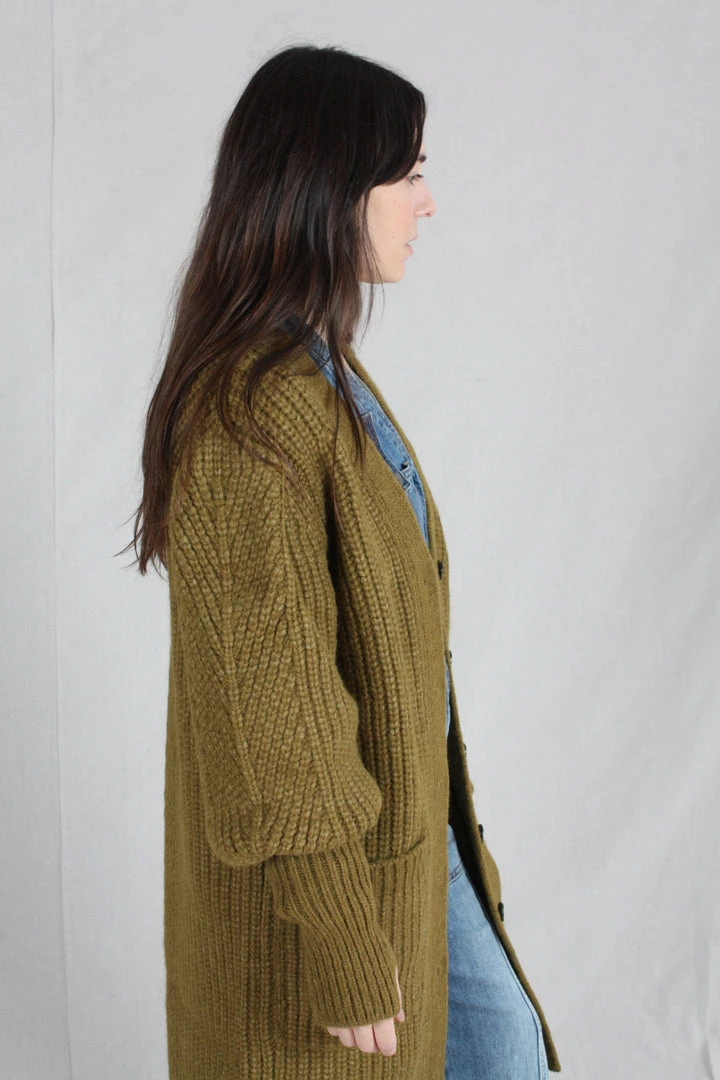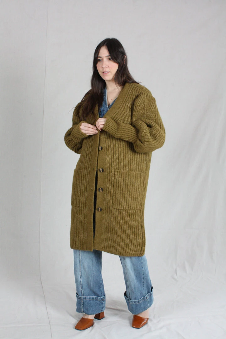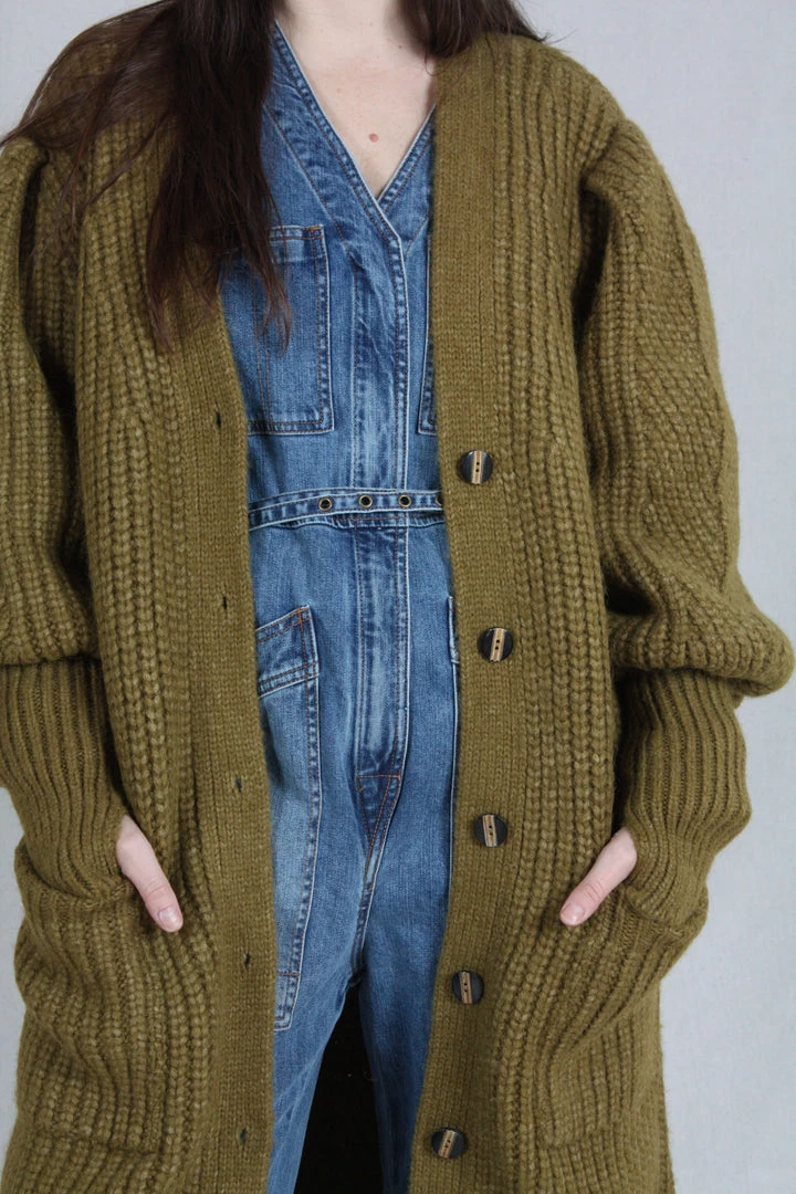 The Aiden Cardigan is knitted in a lofty alpaca wool, in a soft shade of tapenade. This oversized cardigan features a deep, open neck and full sleeves with an exaggerated elongated cuff with thumbholes.