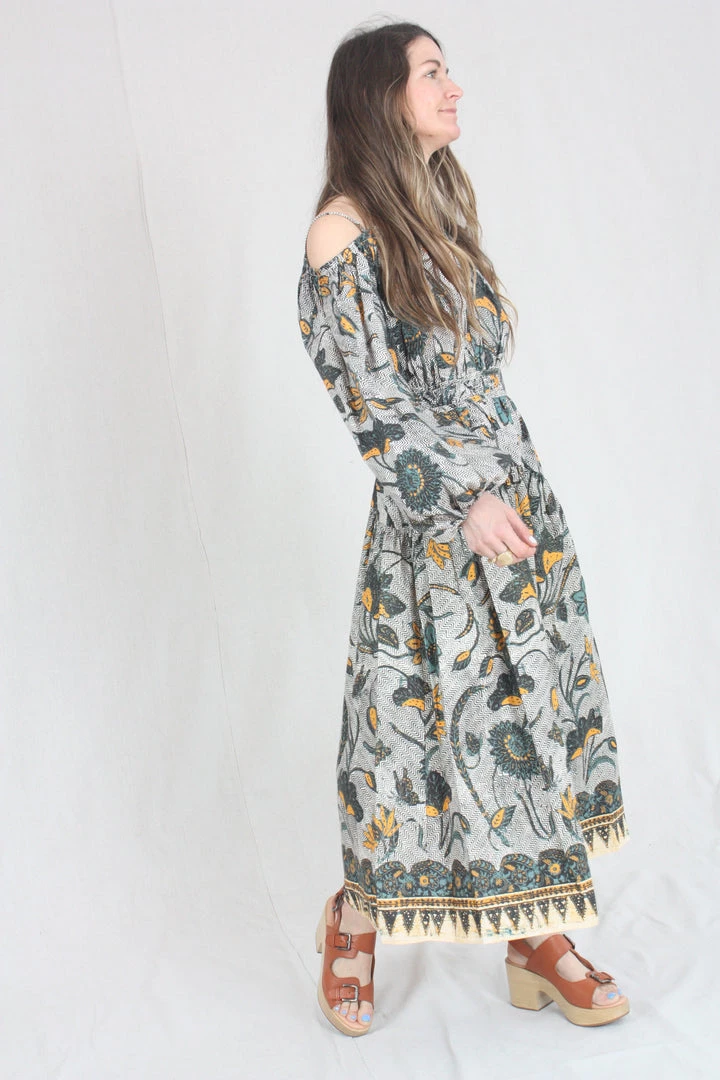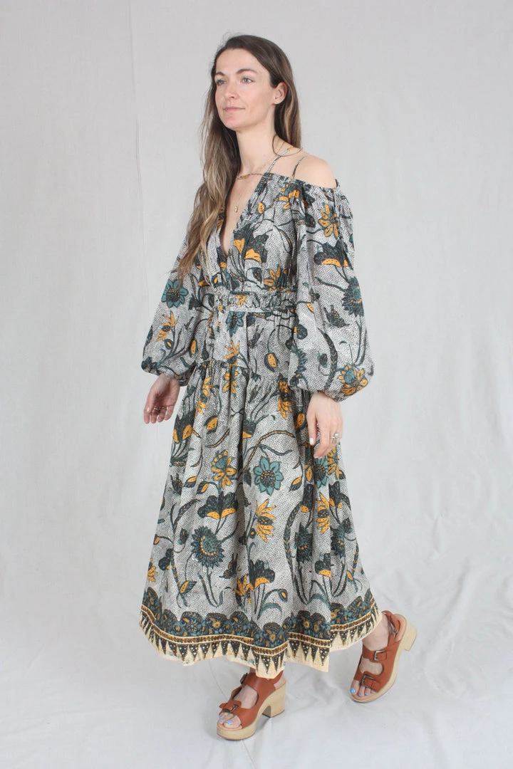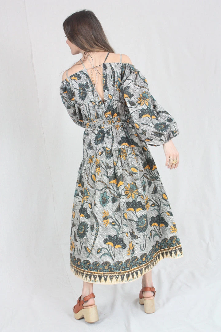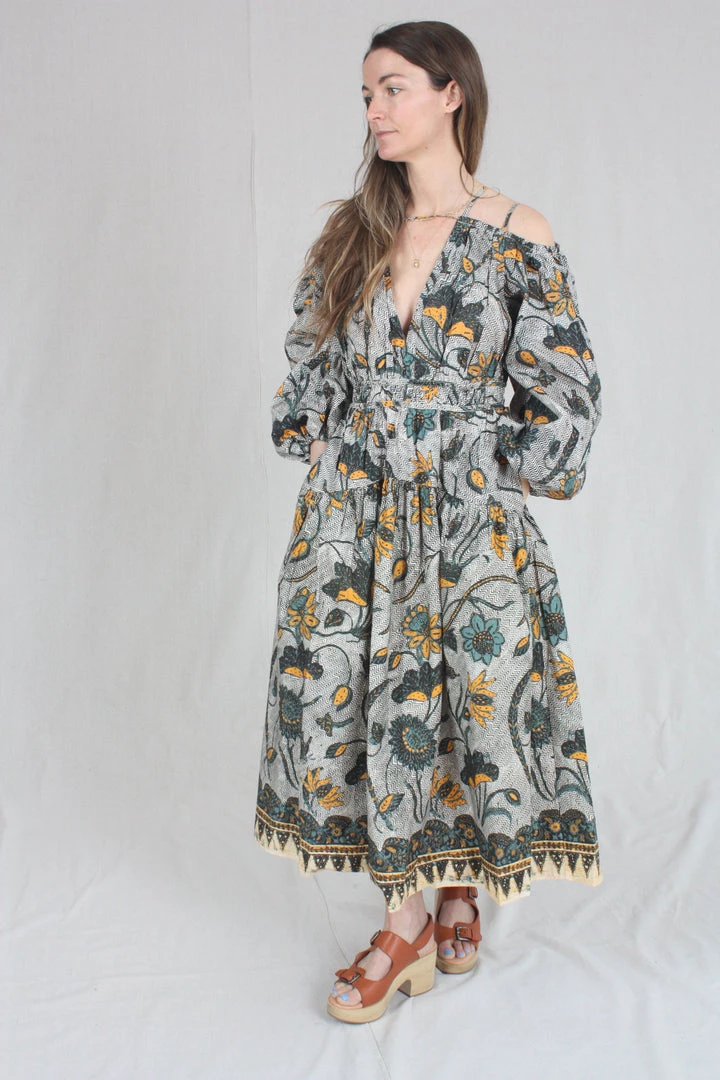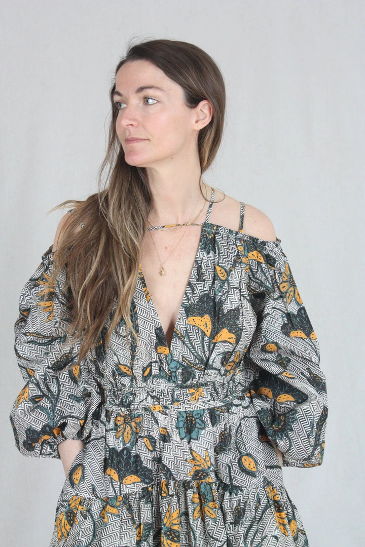 The Tahlia Dress is a stunning new silhouette, cut in an UJ signature cotton poplin and patterned with large-scale florals across a subtle geometric background. Barely-there straps suspend the off the shoulder cut, met with a deep v cut at the center front. This dress has a fixed waist and hidden side-seam zipper.