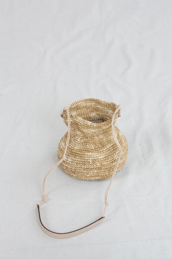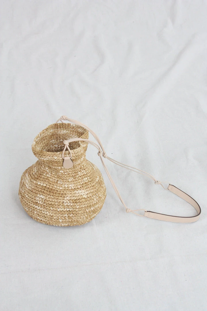 The Tulip Basket is made out of a natural raffia and features a crossbody strap that widens at the shoulder for a comfortable wear.