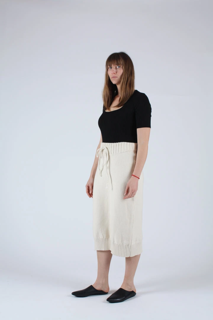 Textured skirt with a slight cocoon shape and rib bottom that hits below the knee. Curved rib waist with crochet tie.