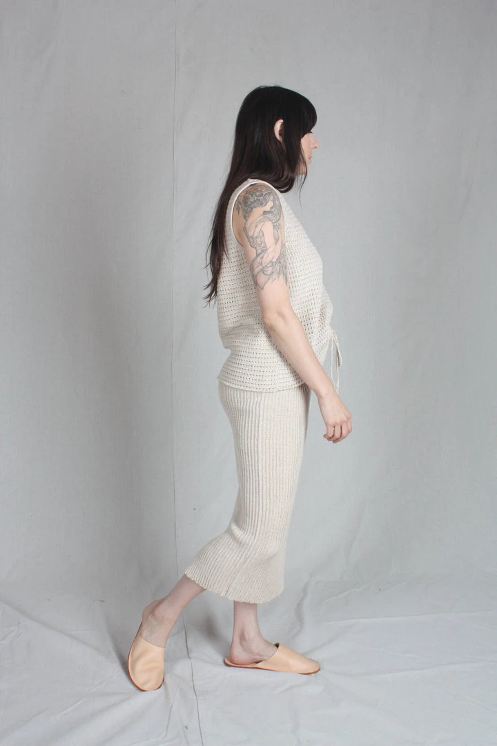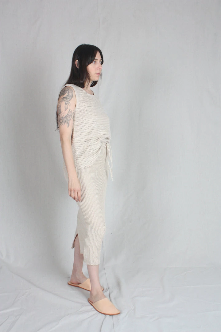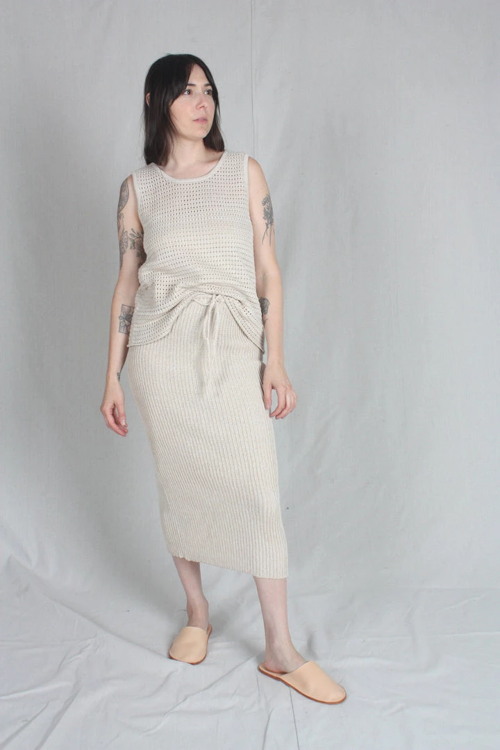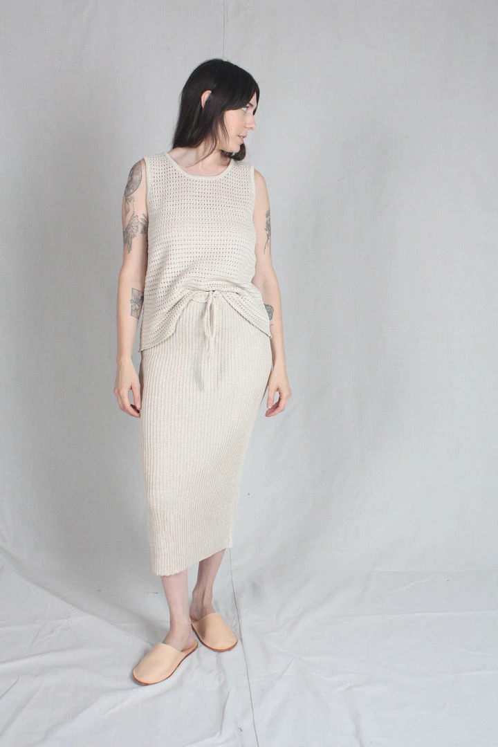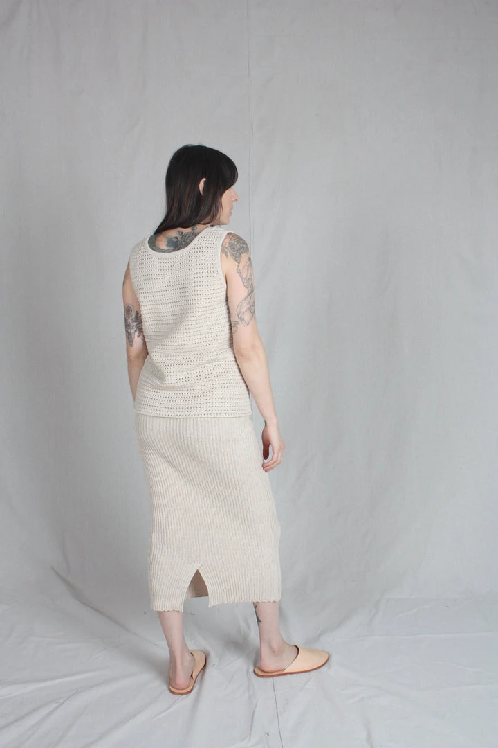 Tube skirt in a rib stitch with a center back slit, crochet tie and elastic waist. In a medium gauge knit, it hugs but isn’t sheer.