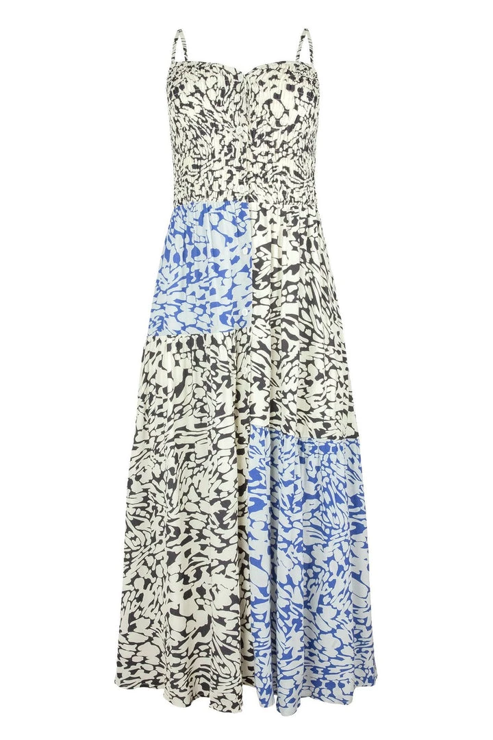 A smocked bodice dress with spaghetti straps and a full midi skirt. Features a patched body in both our tonal blue and graphic black and white abstract animal print.