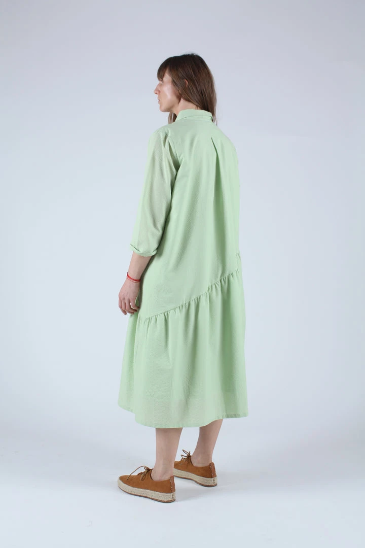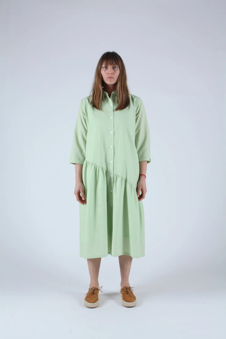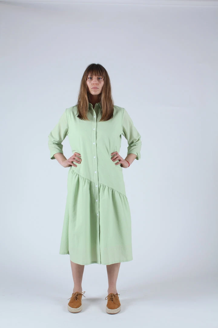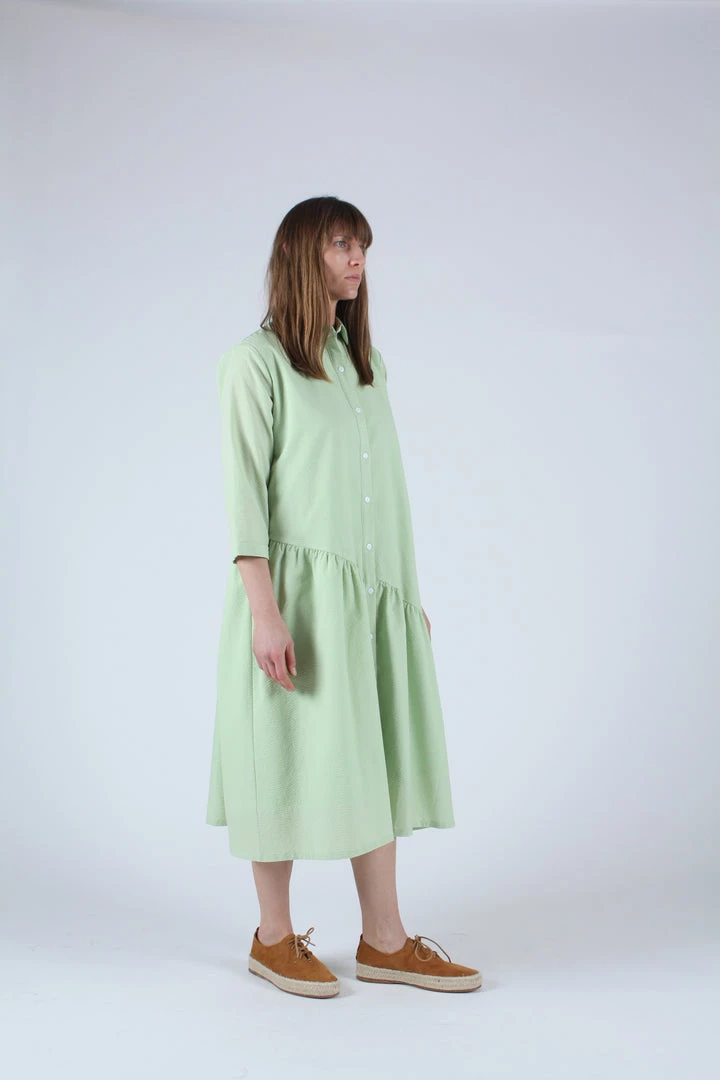 A relaxed shirt dress in Celery green seersucker. Features an asymmetrical gathered hemline, side seam pockets and button front closure.