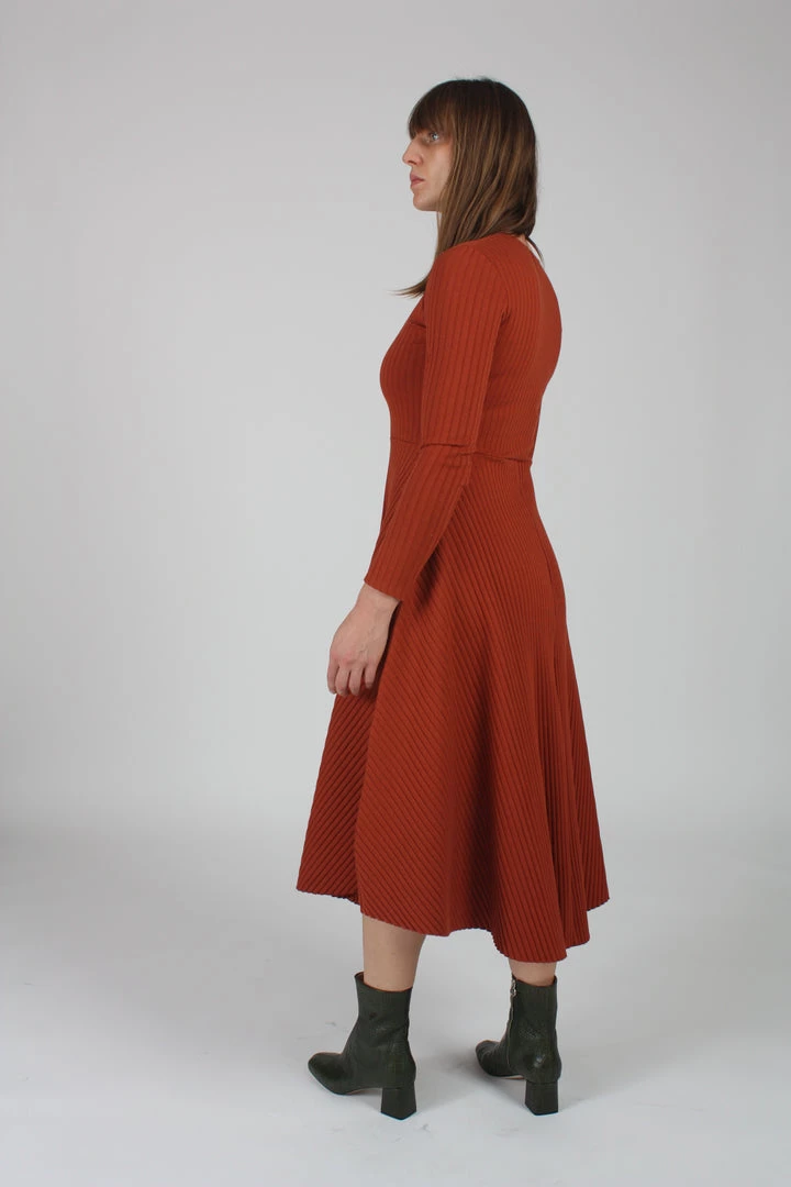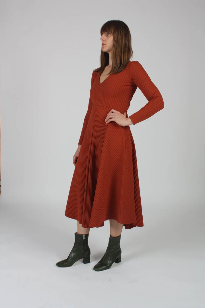Fitted dress in rich ribbed stretch Pima cotton. Flattering terracotta color, v neckline, fitted bodice and A line skirt.