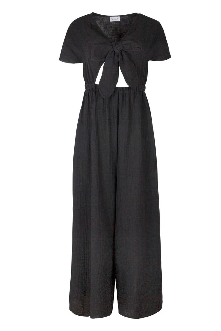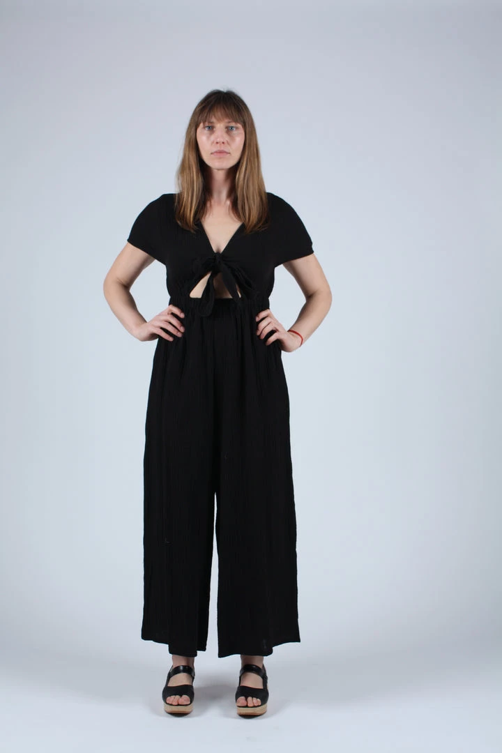 An effortless, relaxed black jumpsuit in super soft black cotton gauze. Features a comfortable elastic waist, tie front bust, cut out detail and side seam pockets.