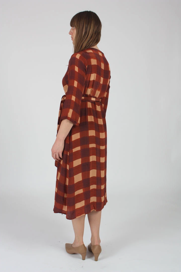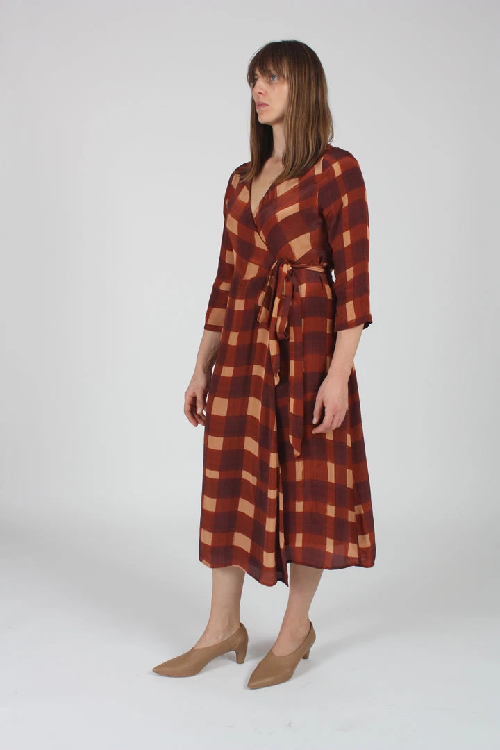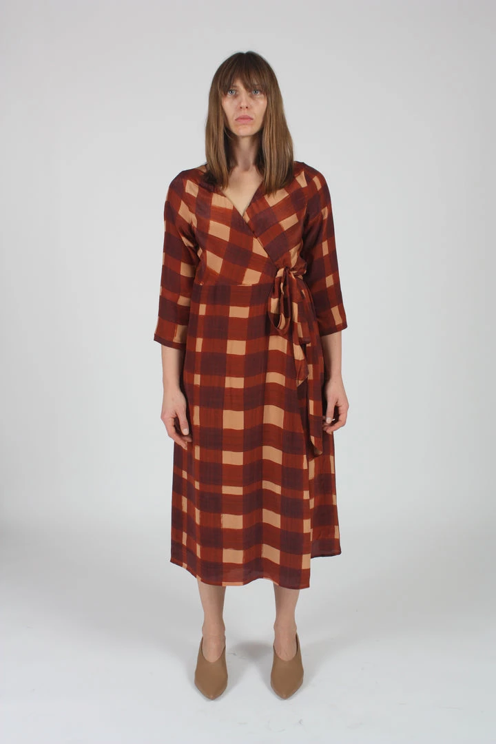 A classic wrap dress with a 3/4 sleeve, midi-length hemline and adjustable wrap-around closure. Featured in a beautiful hand-painted plaid. Lined.